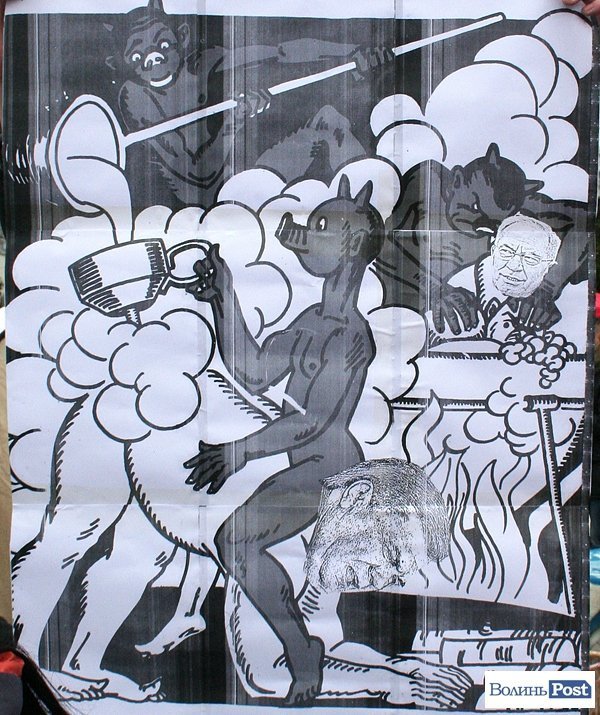 Також хтось приніс карикатуру на Віктора Януковича та Миколу Азарова. На малюнку було зображено політиків у пеклі. Януковича катували чорти, заливаючи розпечену рідину в задній прохід.