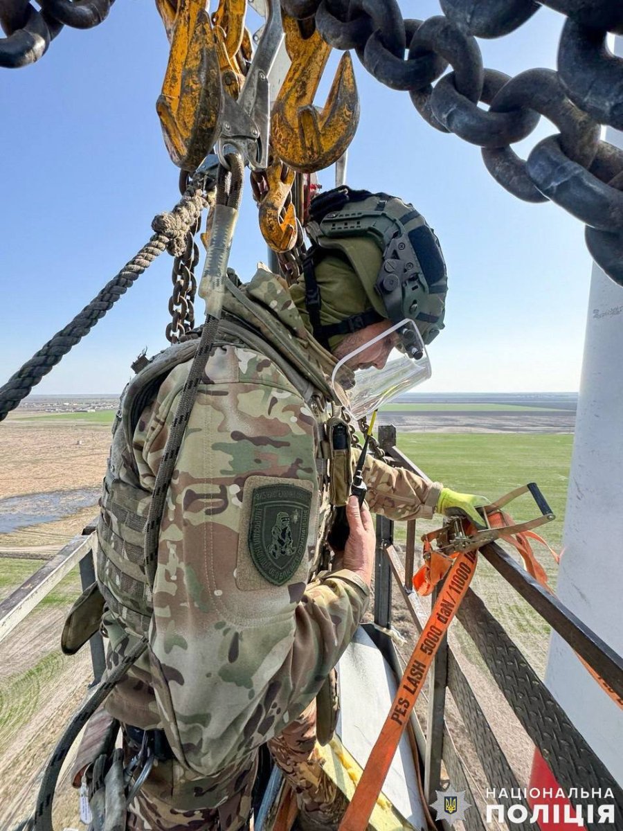 Уламки та бойову частину ворожого БпЛА, що становила небезпеку, поліцейські демонтували з висоти 55 метрів, що еквівалентно 18-поверховому будинку.