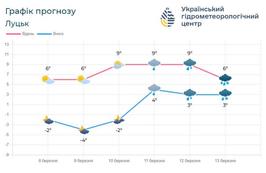 9-10 березня збережеться суха погода. Температура вночі 1-6⁰ тепла, вдень 6-11⁰ тепла.