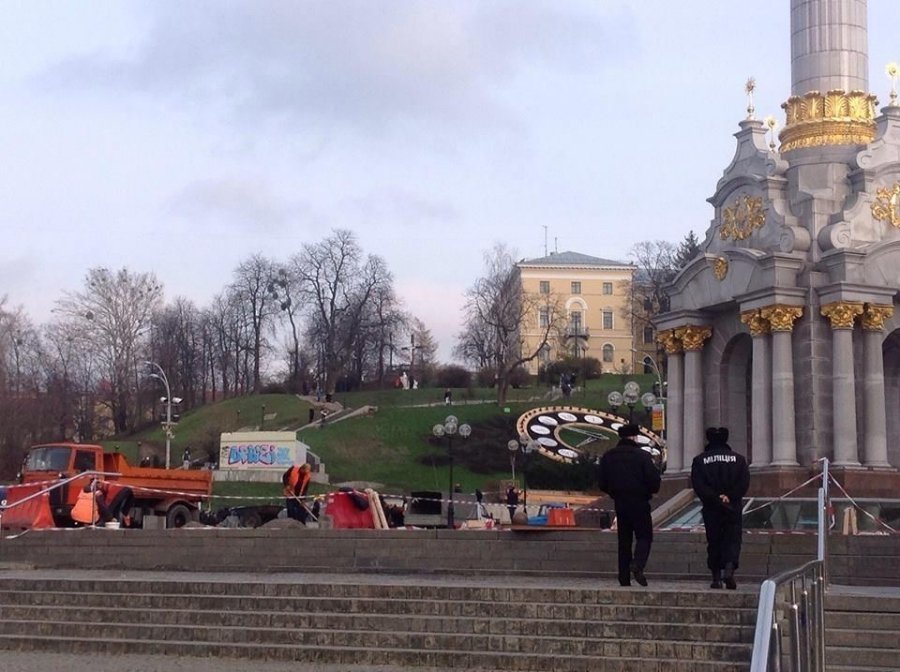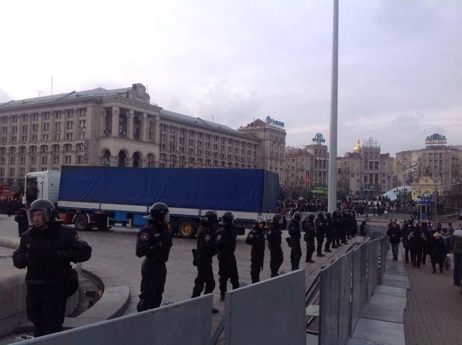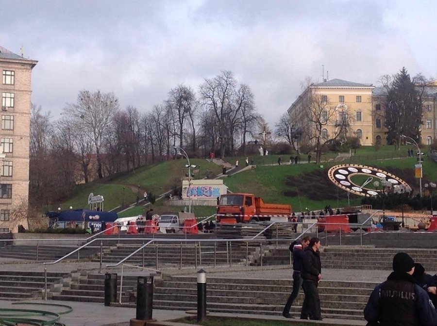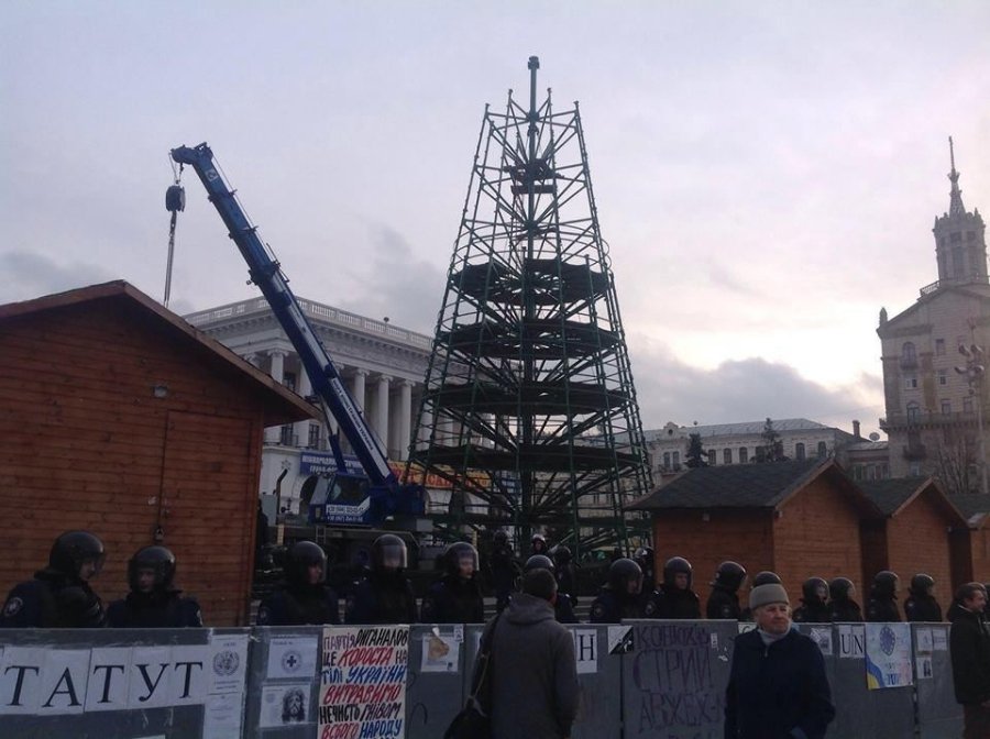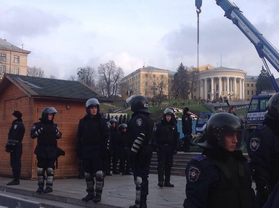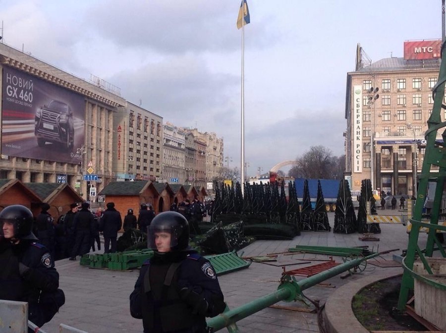 На Майдан приїхали машини з краном встановлювати новорічну ялинку. Після цього відбулися зіткнення між активістами і правоохоронцями.