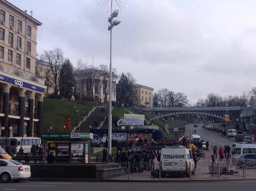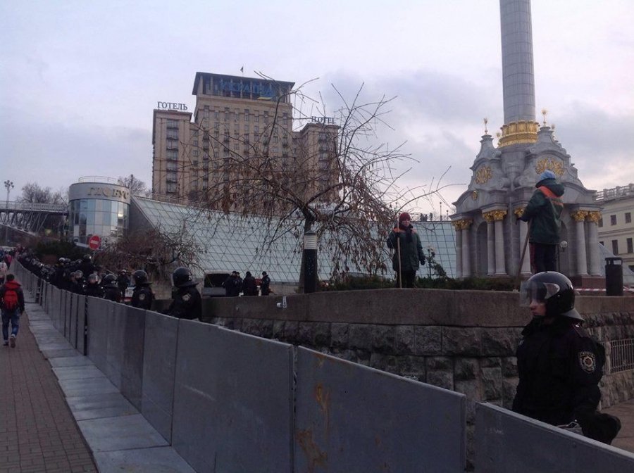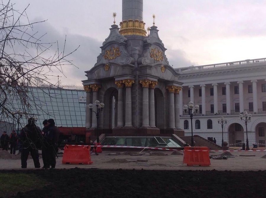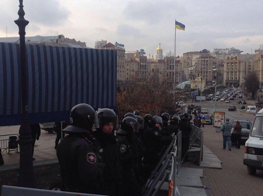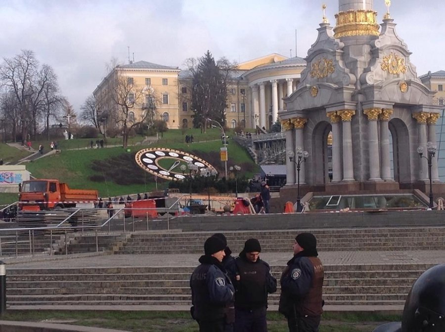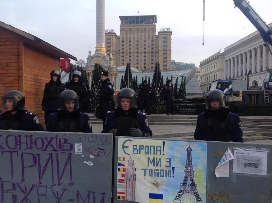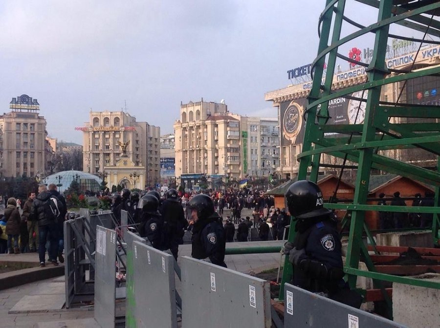 На Майдан приїхали машини з краном встановлювати новорічну ялинку. Після цього відбулися зіткнення між активістами і правоохоронцями.