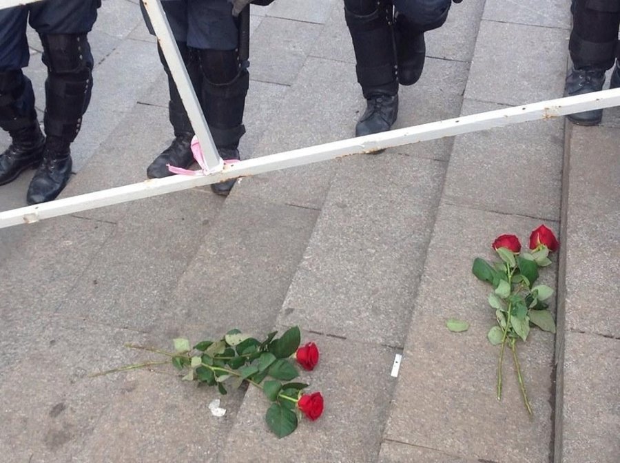 Квіти залишають прямо в огорожі, за яким стоять правоохоронці, пише Обозреватель.