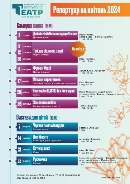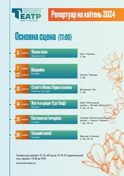 Волинський академічний обласний український музично-драматичний театр імені Тараса Шевченка підготував для поціновувачів театрального мистецтва анонс вистав, що відбудуться у квітні.