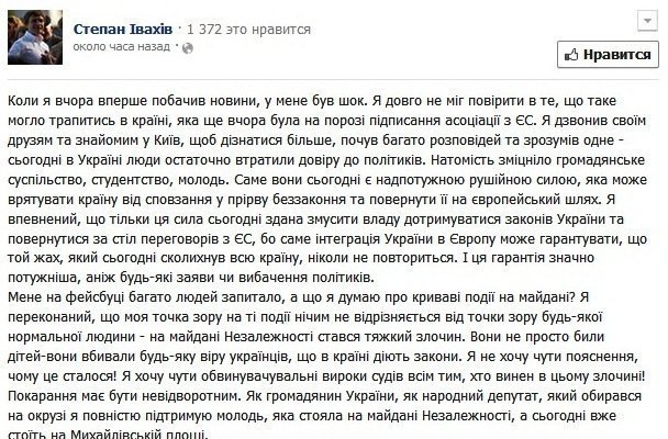 «Коли я вчора вперше побачив новини, у мене був шок. Я довго не міг повірити в те, що таке могло трапитись в країні, яка ще вчора була на порозі підписання асоціації з ЄС. Я дзвонив своїм друзям та знайомим у Київ, щоб дізнатися більше, почув багато розповідей та зрозумів одне - сьогодні в Україні люди остаточно втратили довіру до політиків», - написав Івахів.