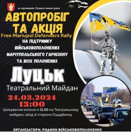 "24 березня на Театральному майдані о 13.00 відбудеться автопробіг на підтримку військовополонених Маріупольського гарнізону та усіх полонених. Шикування колони о 12.30, заїзд зі сторони Ощадбанку", - наголошують організатори.