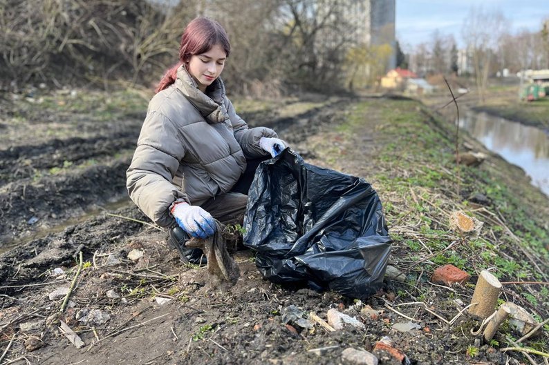 Другокурсниця Анна Деркач збирала залишки поліетиленових пакетів вздовж річки. Дівчина говорить: живе неподалік, тому приєдналася до прибирання території поблизу "Дитячої залізниці".
