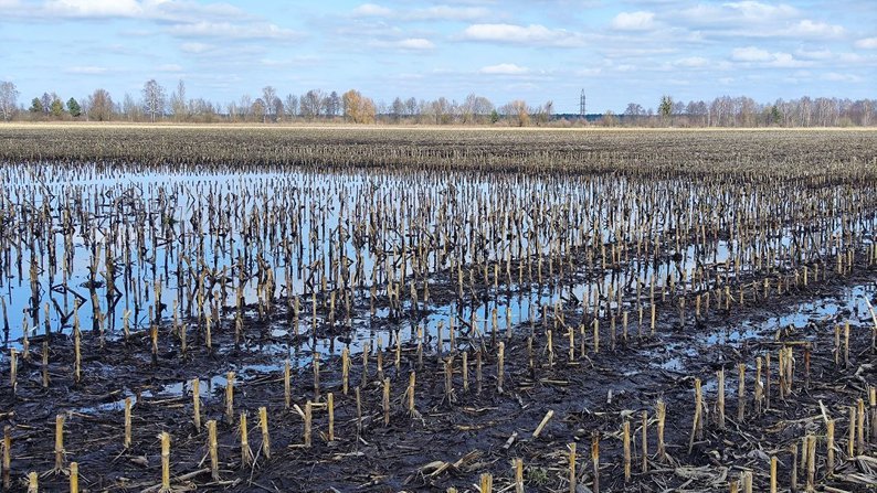 "Ось тут ми бачимо приклад такого "блюдця" — підтоплення на осушуваних землях. Поряд є канал, який прочищався, але гончарний дренаж тут у незадовільному стані, тому ми бачимо такі підтоплення, які можуть вплинути на загальну сільськогосподарську продукцію", — сказав фахівець.