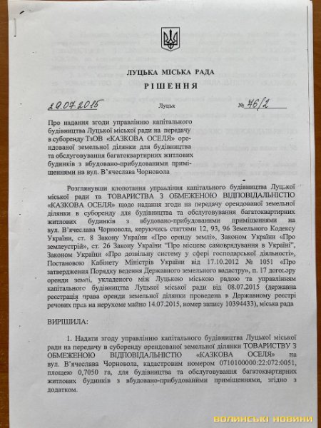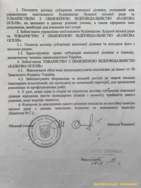 Але ні протести місцевих жителів, ні суди не стали на заваді забудовнику отримати ще 0,7 гектара землі поряд, причому не купуючи її. У червні 2015 року депутати Луцької міської ради голосують за надання цієї земельної ділянки в оренду управлінню капітального будівництва Луцької міськради, а через місяць – за передання її в суборенду забудовнику ТзОВ «Казкова оселя», співвласником (фактично власником) якої на той час є Андрій Покровський.