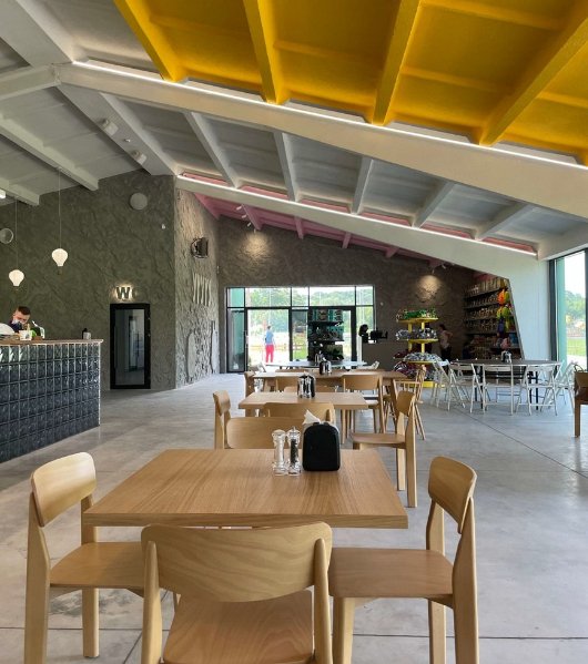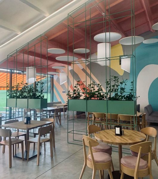 У великих яскравих проєктах акцент потрібно робити на якорях, за які можна зачепитись. У цьому проєкті такими якорями стали кубічні форми. Кубики – це такий перший дитячий елемент, яким вони грались, вивчали текстуру. Такі великі куби стали змінними інсталяціями та окрасою рецепції кафе і території поряд.