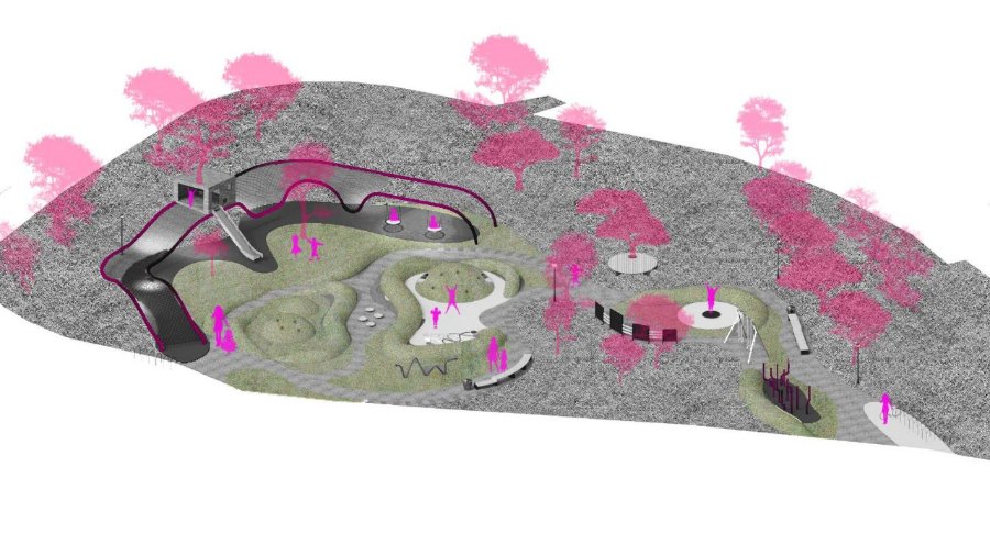 «Головний елемент дитячого простору – лазанка, яка повторює контур дерев, тим самим, коли людина тут знаходиться, вона відчуває такий буфер: з боків пагорби, а попереду простір на сам майданчик», – зазначає Аліна Саніна.