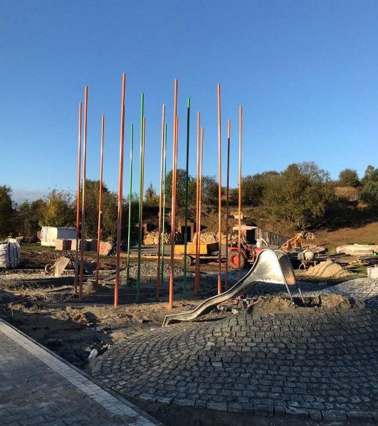 Коли заходимо на майданчик, відкривається зона з пагорбами (елементи у формі тунелю з гумовим покриттям), зліва запроєктована лазанка, задумана як бар'єр, який відгороджує простір від лісу.