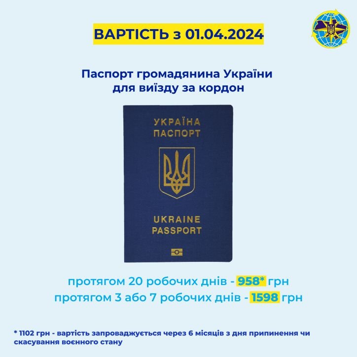 "З 1 квітня 2024 року ДП "Поліграфічний комбінат "Україна" змінює вартість бланків паспорта громадянина України для виїзду за кордон. У зв’язку з цим зростає і загальна вартість оформлення цього документа", - зазначають у ДМСУ.