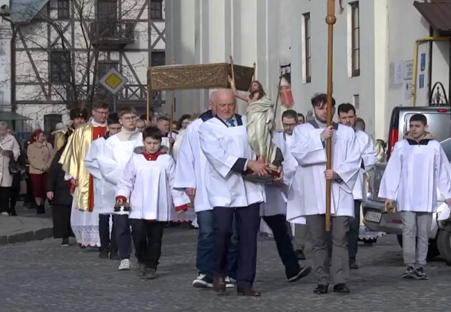 У костелі Петра й Павла у Луцьку відзначення Пасхи розпочали із хресної ходи, після чого відбулося святкове богослужіння, яке очолив єпископ-ординарій Луцької дієцезії РКЦ Віталій Скоморовський. Особливої урочистості богослужінню додавало звучання органу.
