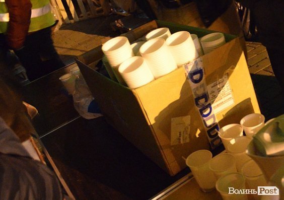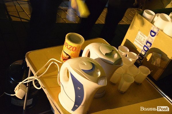 Напої стали розливати приблизно о 17:30. На трьох столах розмістили ящик зі стаканчиками та ложками, чаєм, кавою, цукром. Гарячу воду розливали із чайників з євросимволікою.