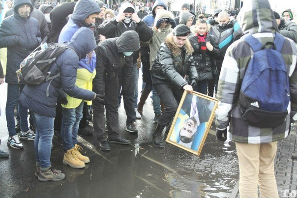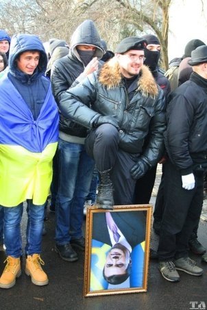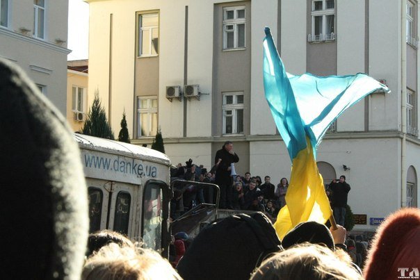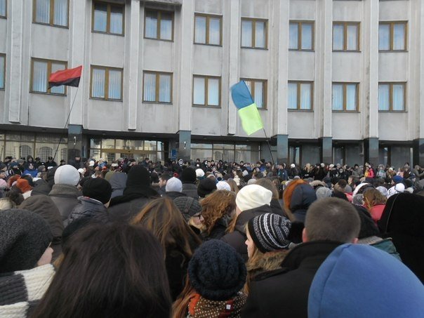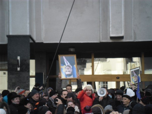 Також біля "білого дому" підняли прапор Європи. А з кабінетів облради винесли три портрети Януковича, які згодом знищили.