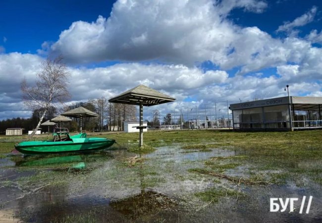 Світязь вийшов з берегів та затопив пляжі. Навіть катамаран, що лишили на березі, оточила вода.
