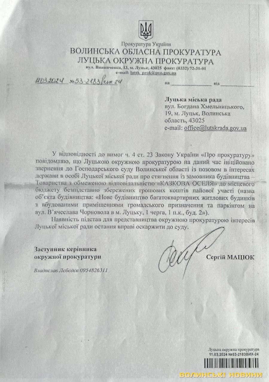 Луцька окружна прокуратура ініціювала звернення до Господарського суду Волинської області із позовом про стягнення із замовника будівництва ТОВ «Казкова оселя» до місцевого бюджету незаплачених коштів пайової участі, про що повідомила відповідним листом міську раду.