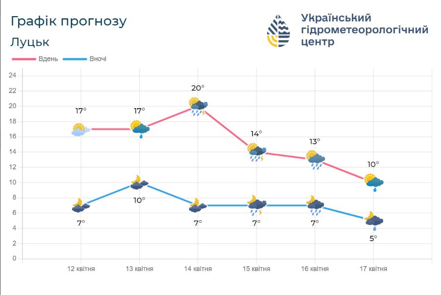Температура вночі 7-12° тепла, вдень 18-23° тепла, повідомляє у телеграмі Волинський обласний центр з гідрометеорології.