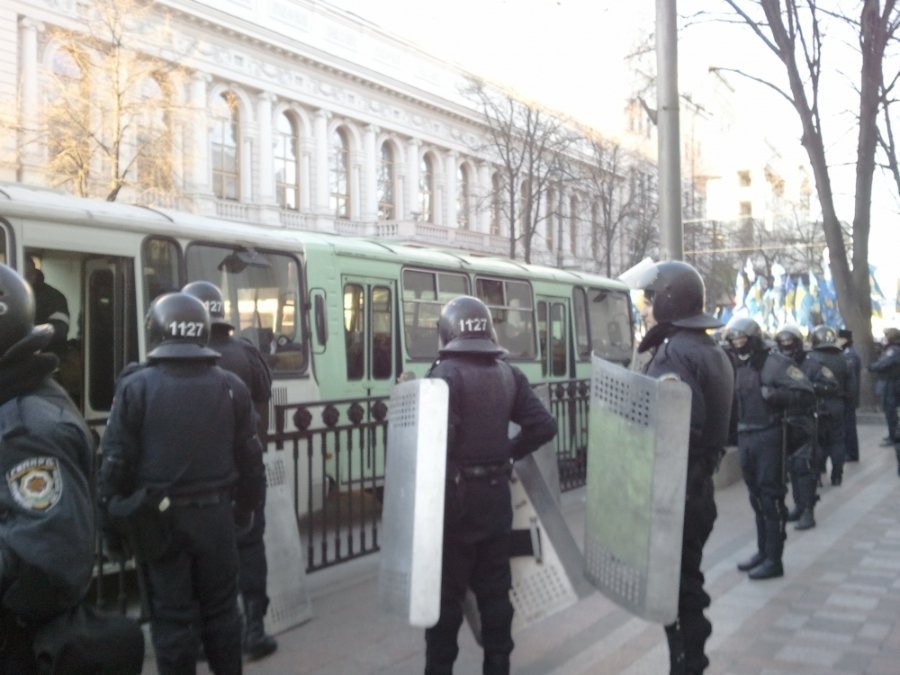 Трохи далі біля центрального входу парламенту мітингує близько трьох сотень із прапорами "Свободи", УДАРу і "Батьківщини". Вулиця Грушевського перекрита. Навколо паркану ВР більше 30 автобусів, а під будівлею близько тисячі "беркуту".
