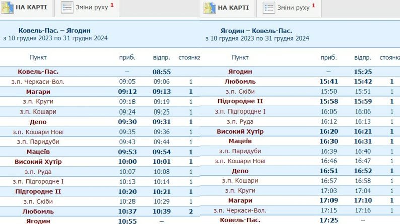 Пасажирів електрички просять врахувати зміни під час планування подорожей на сполученні від Ковеля до Ягодина. Після 27 квітня графік руху залишиться попереднім.