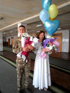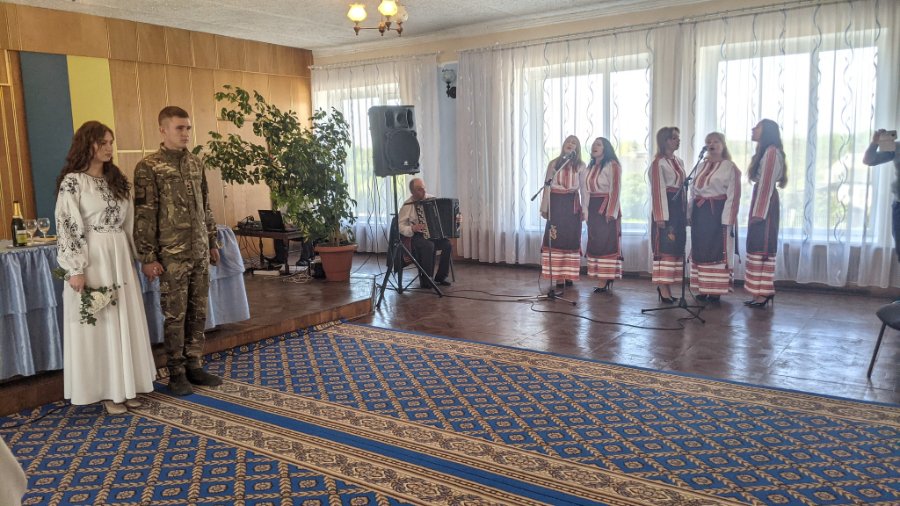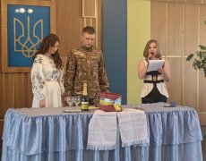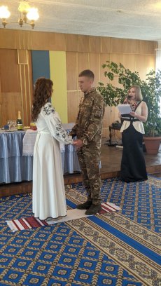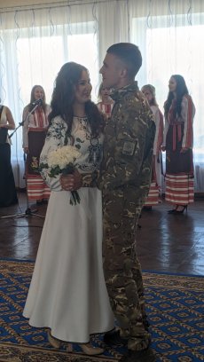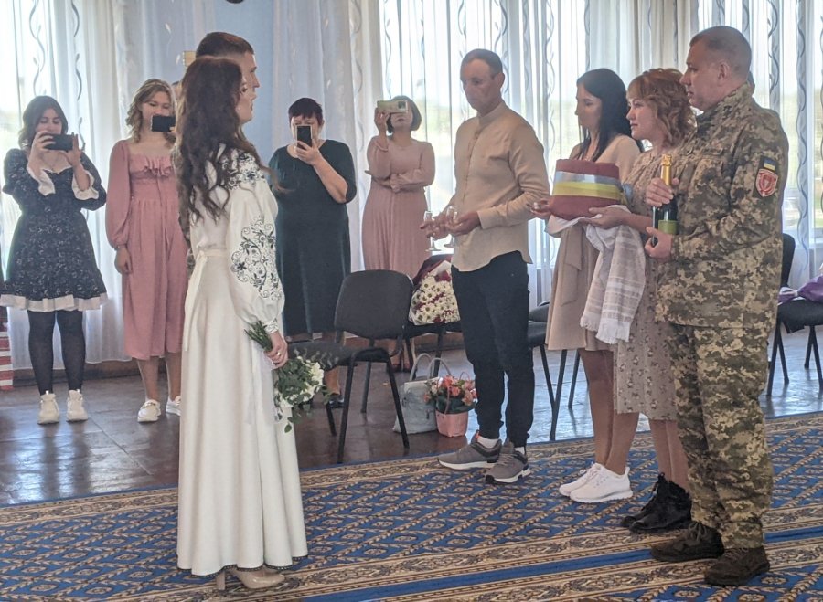 Це пам’ятна подія для закоханих, котрі за традицією стали на весільний рушничок щастя. Молода – у шлюбній вишиваній сукні, а молодий у своєму військовому однострої. Закохані обмінялися шлюбними обручками, традиційно випили келих шампанського вина, скріпили своє рішення підписами та отримали від рідних, друзів, побратимів-захисників святкові привітання та побажання.