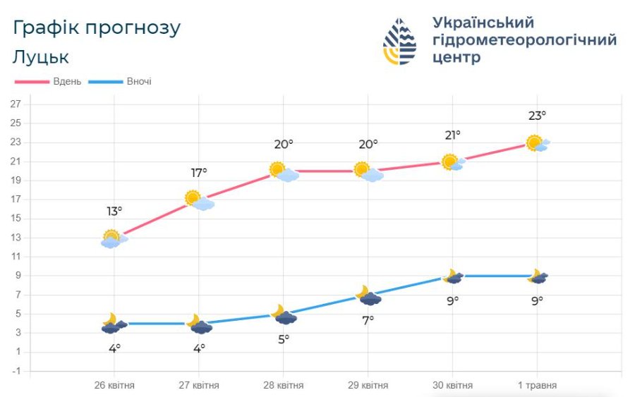 Тепле південне повітря зумовлюватиме потепління по всій Україні. Вже з 28 квітня нічна температура становитиме 5-10⁰ , а денна сягатиме 20-25⁰ тепла.