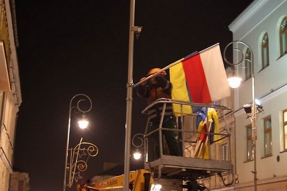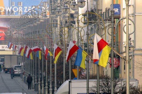 У польському місті Кєльце вздовж вулиці розвісили поряд українські, польські прапори та символіку ЄС.