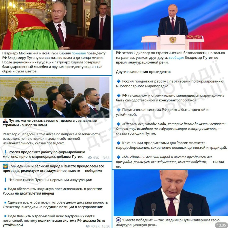 Російський диктатор володимир путін у своїй промові під час «інавгурації» висловився про нібито готовність до діалогу із Заходом, просуваючи пропагандистський наратив про «миролюбність» рф.