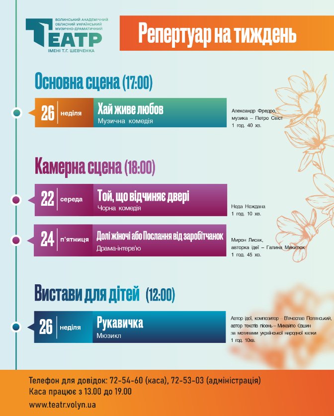 Волинський академічний обласний український музично-драматичний театр імені Тараса Шевченка запрошує лучан та гостей міста на перегляд вистав.