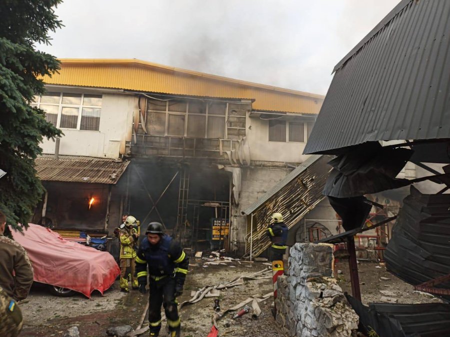Київська міська державна адміністрація опублікувала фото наслідків ракетного удару росіян по Києву. Внаслідок падіння уламків збитих повітряних цілей у Голосіївському районі Києва горіло СТО та автомийка, вогнем пошкоджені 6 авто і складські приміщення.