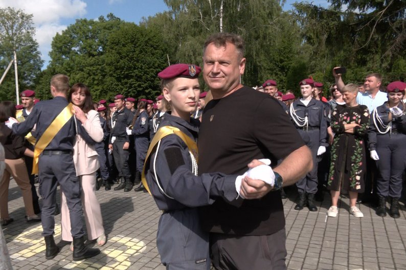 На останній дзвоник до доньки-випускниці Луцького ліцею №28 з посиленою фізичною підготовкою приїхав військовослужбовець 100 бригади Олег Адамчук.