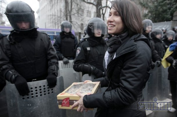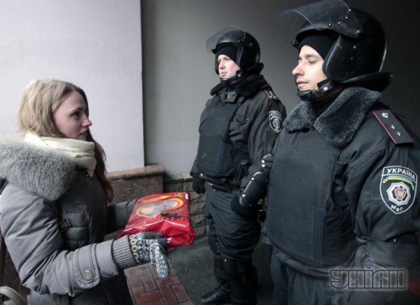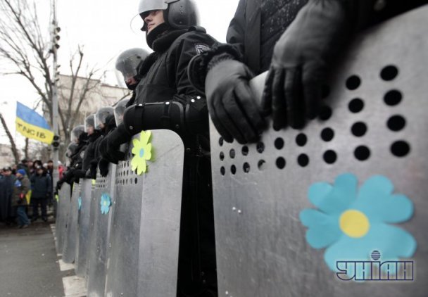 Учасниці Євромайдану перетворили грізних міліціонерів на "милих хлопців з квіточками".
