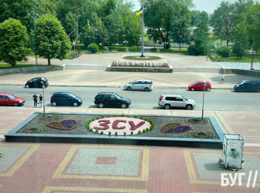 Клумба складається з напису ЗСУ та двох композицій у формі серця з синьо-жовтими квітами.