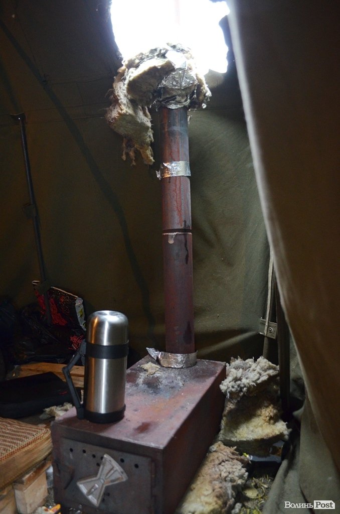 В одному з наметів встановлена «буржуйка», в іншому – «теплова пушка». Цим і гріються.