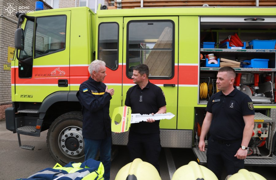 Символічний ключ від пожежного автомобіля він вручив головному рятувальнику Волині Мирославу Дем’янчуку, а він, своєю чергою, передав автомобіль луцьким вогнеборцям.