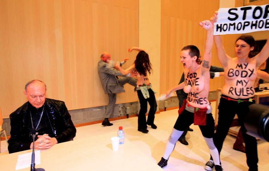 Активістки Femen щойно облили водою Архієпископа Мехелена-Брюсселя і примаса Бельгії Андре-Жозефа Леонара під час конференції у Брюссельському університеті, 23 квітня 2013. YVES HERMAN, Бельгія