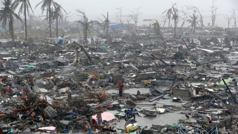 Люди, які вижили після тайфуну Хайян, стоять серед сміття і руїн будинків, зруйнованих стихією в центральній частині Філіппін, 10 листопада 2013. ERIK DE CASTRO, Філіппіни