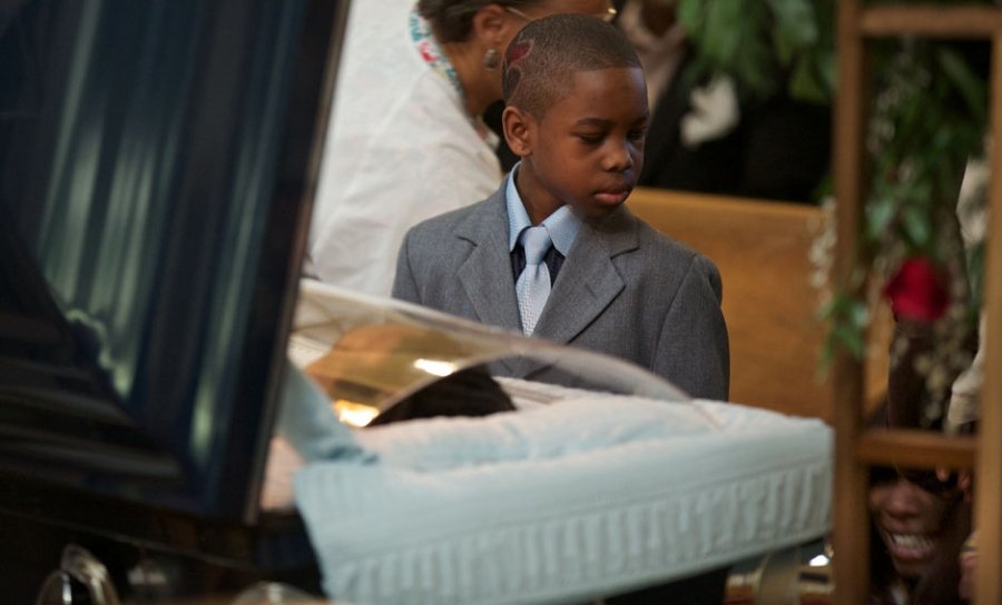 Ронні Чемберс молодший дивиться на невтішну матір Таіту Майлс під час похорону батька, який став жертвою стрілянини в Чикаго, 4 лютого 2013. JOHN GRESS, США