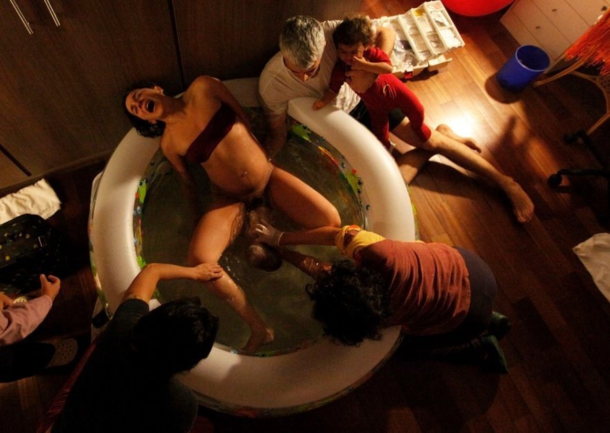 Акушерки допомагають Мануелі Мітре народити другу дитину Гаель у басейні з водою, в той час як її чоловік Андре (2-й праворуч) і донька Еліс дивляться, Сан-Паулу, 6 листопада 2013. NACHO DOCE, Бразилія
