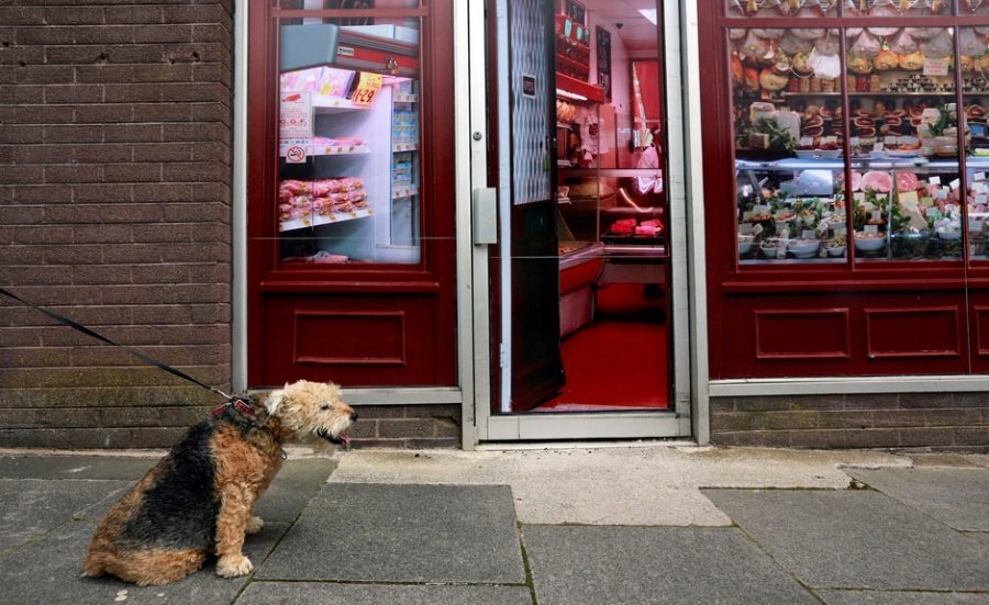 Чоловік гуляє з собакою повз зачинений магазин, обклеєний постерами, через які він виглядає як працюючий і забитий продуктами, 3 червня 2013. CATHAL MCNAUGHTON, Північна Ірландія