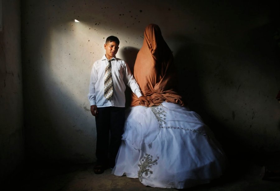 Молодий палестинський наречений Ахмед Собох, 15 років, і його наречена Тала, 14 років, під час їхнього весілля у Бейт-Лахії, недалеко від кордону між Ізраїлем і північчю сектору Газа, 24 вересня 2013. MOHAMMED SALEM, Газа