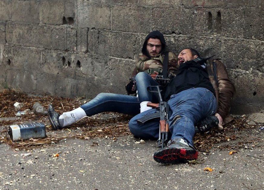 Боєць Вільної сирійської армії (зліва) дивиться на свого товариша, якого підстрелив снайпер під час вуличного бою в передмісті Дамаску Айн-Тармі, 30 січня 2013. GORAN TOMASEVIC, Сирія