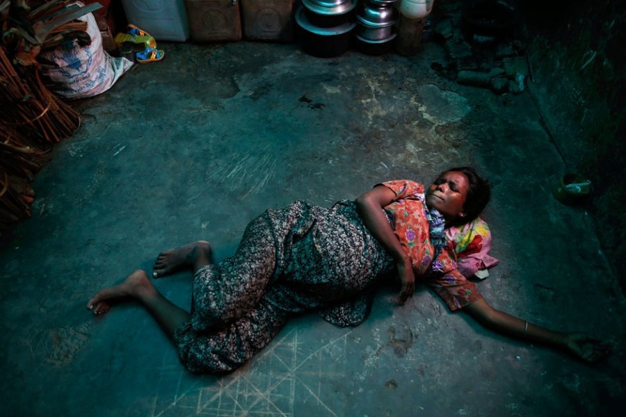 Мусульманка Рома Хатту на дев'ятому місяці вагітності відчуває сильний біль під час родових перейм на голій підлозі колишньої фабрики, яка є притулком для її сім'ї, біля Сітуе, 28 квітня 2013. DAMIR SAGOLJ, М’янма