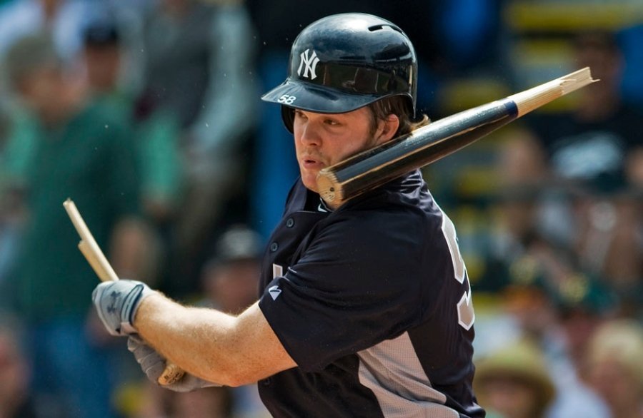 Поламана бита Бреннана Боша з «Нью-Йорк Янкіз» вдаряє його по обличчю під час матчу проти Піттсбурзьких піратів у Флориді, 17 березня 2013. STEVE NESIUS, США
