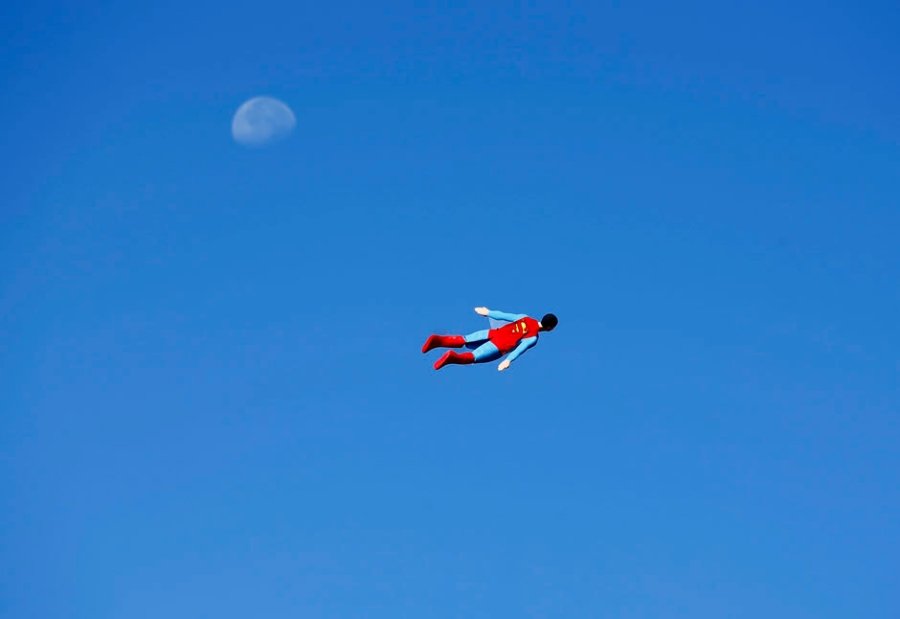 Радіоконтрольований літак-супермен на тлі місяця під час випробування винахідником у Каліфорнії, 27 червня 2013. MIKE BLAKE, США