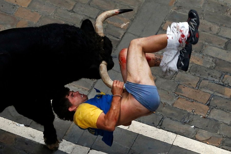 Бик підіймає на роги Дієго Мірайеса під час традиційного забігу на фестивалі в Памплоні, 12 липня 2013. SUSANA VERA, Іспанія