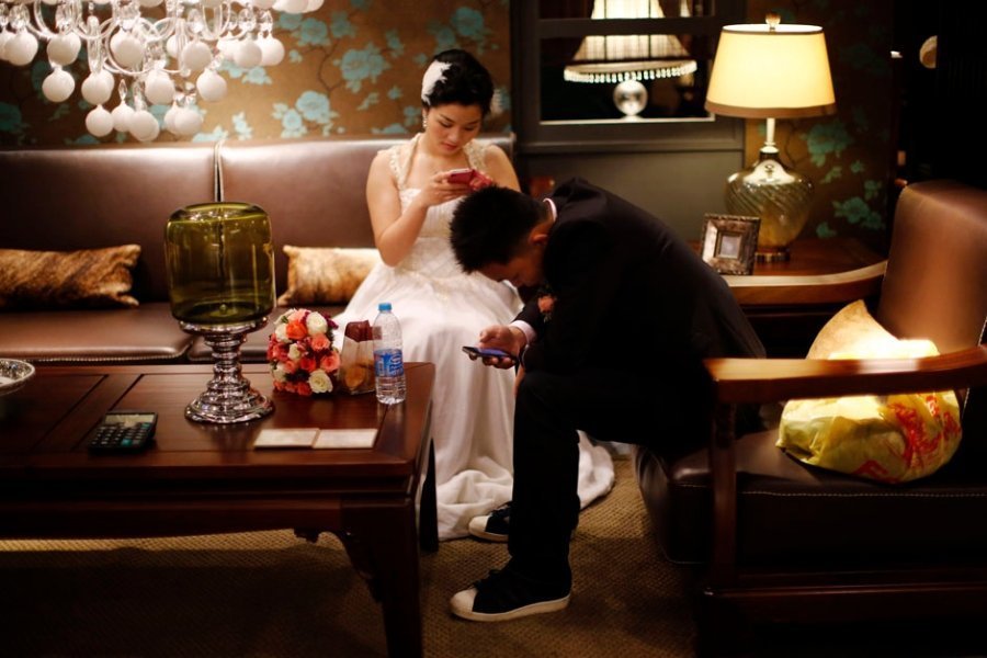 Пара чекає, аби взяти участь у постановці масового весілля, організованої в рамках «заходу сватання», щоб надихнути одинаків одружуватися, у передмісті Шанхаю, 18 травня 2013. CARLOS BARRIA, Китай