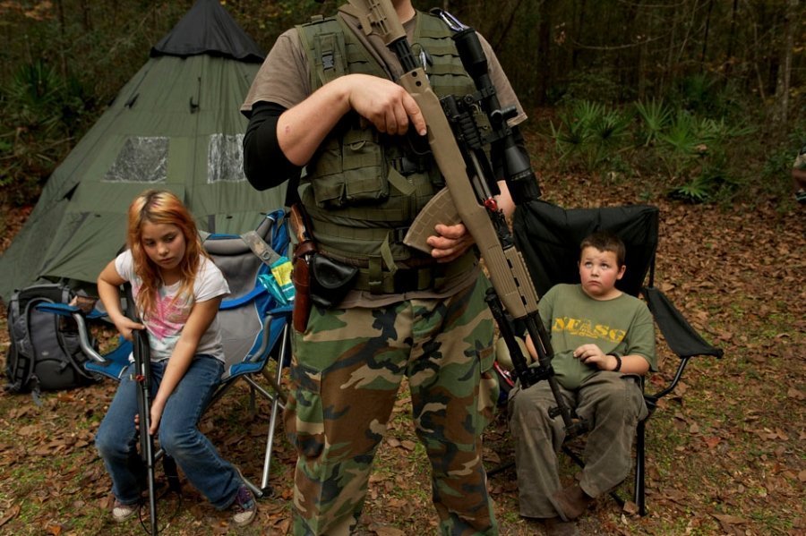 Члени групи виживання Північної Флориди чекають з гвинтівками, перш ніж відправитися для виконання вправи контакту з ворогом під час польових навчань в Олд Таун, штат Флорида, 8 грудня 2012. BRIAN BLANCO, США
