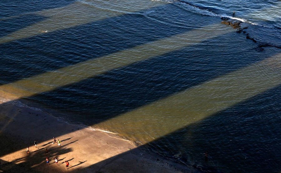 Чоловіки грають у футбол між тінями від будинків на пляжі Бон-В'яжен в Ресіфі, 14 червня 2013. RICARDO MORAES, Бразилія