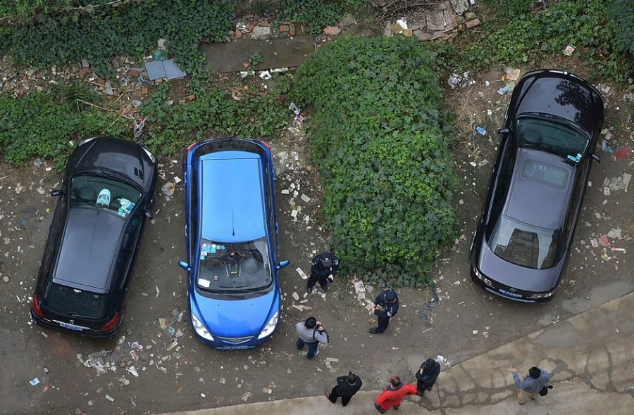 Поліція і свідки дивляться на авто, який заріс рослинами після того, як його покинули більше, ніж на рік в Ченду, провінція Сичуань, 17 жовтня 2013 року. WANG XIAO, Китай